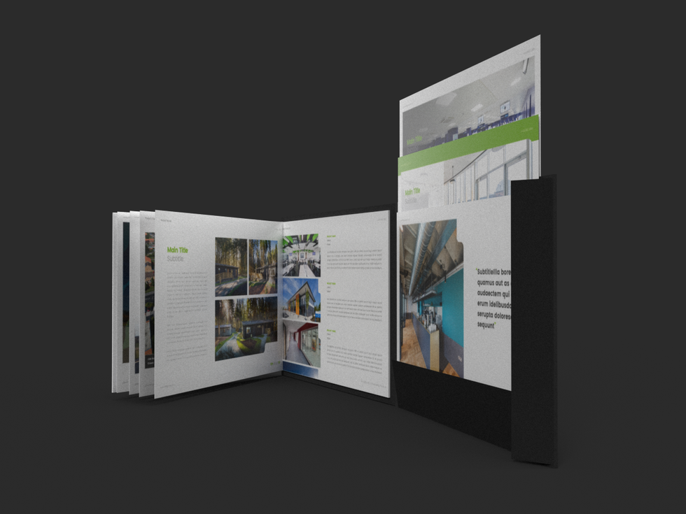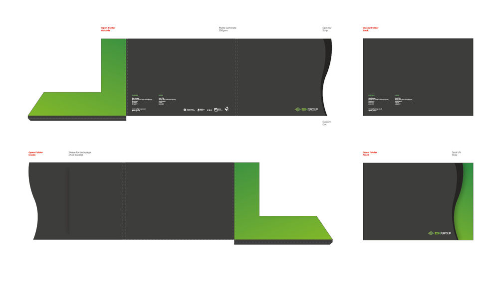 A brochure which is encorporated into a presentation folder. The folder is designed to accomodate A5 landscape documents. This allows the folders to contain bespoke materials which can be printed internally.